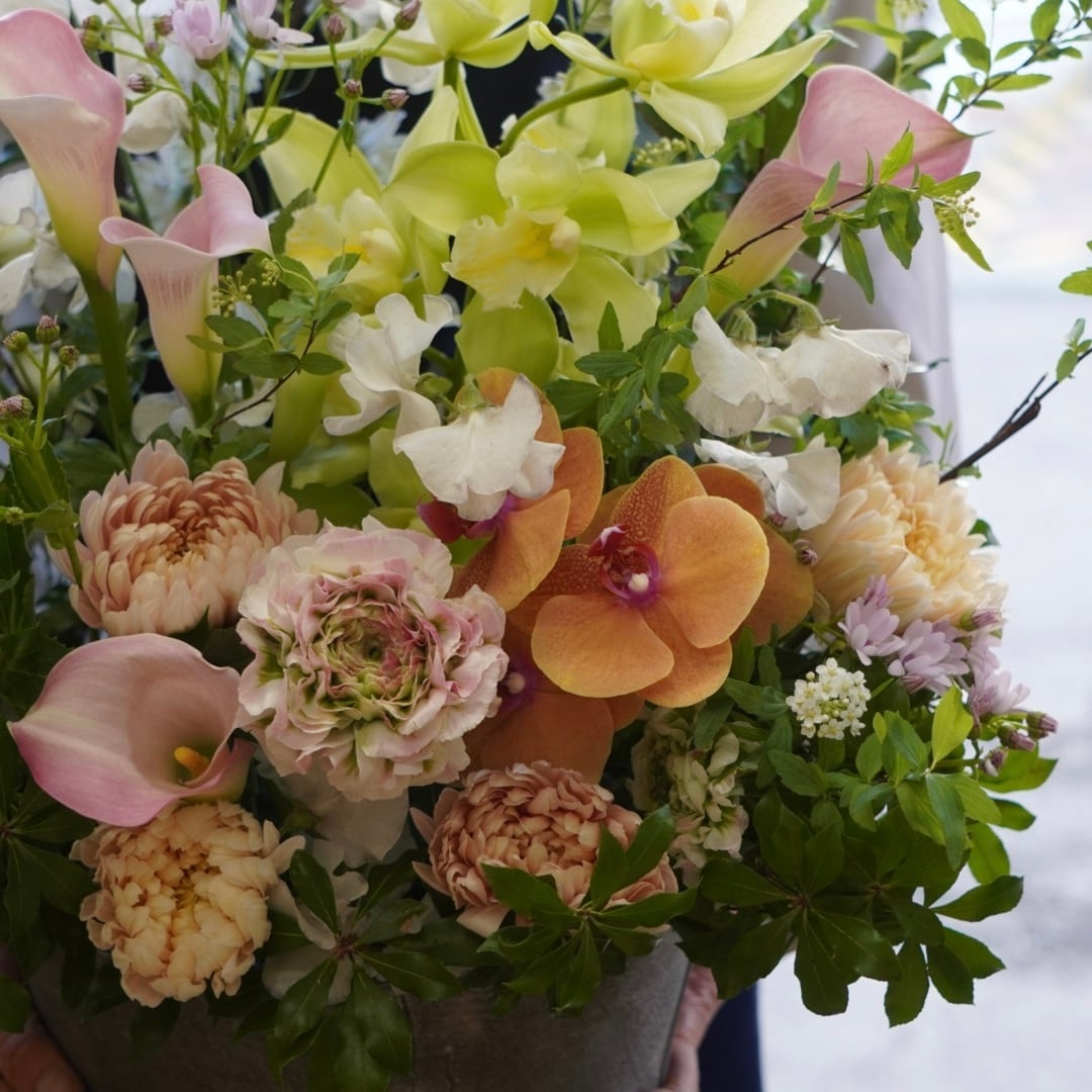 ソフトでシックな印象に。優しいお色をアクセントにしたアレンジメントです